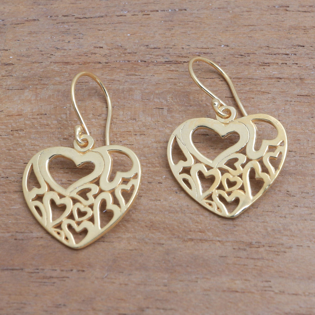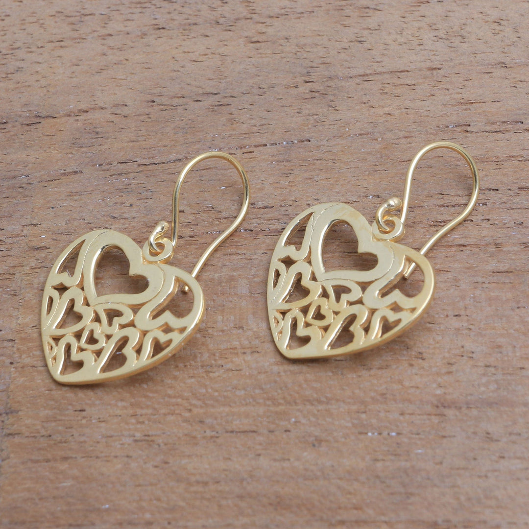 Crafted of 18k gold plated sterling silver with marvelous openwork, two hearts are filled with love in this pair of dangle earrings from Bali. Asmara Putra designs this accessory.