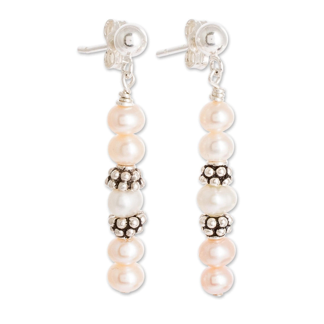 Few things are more classic than a strand of pearls. Guatemalan craftswoman Mirian Bruten adapts this concept to this pair of lovely earrings. Among natural pale pink cultured pearls, she adds textured beads made of sterling silver that each flank a white pearl.