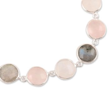 Glittering with soft pink and grey hues, round faceted gemstones of rainbow moonstone, rose quartz and labradorite are framed by sterling silver that gleams in the light. Neetu Barathi designs this fascinating link bracelet from India.