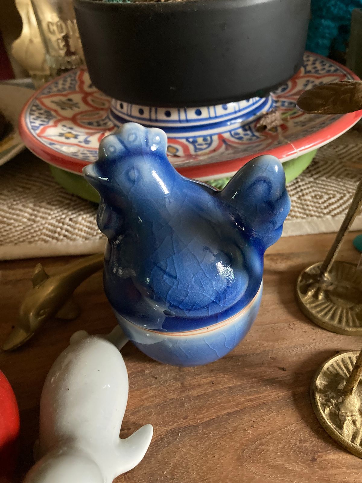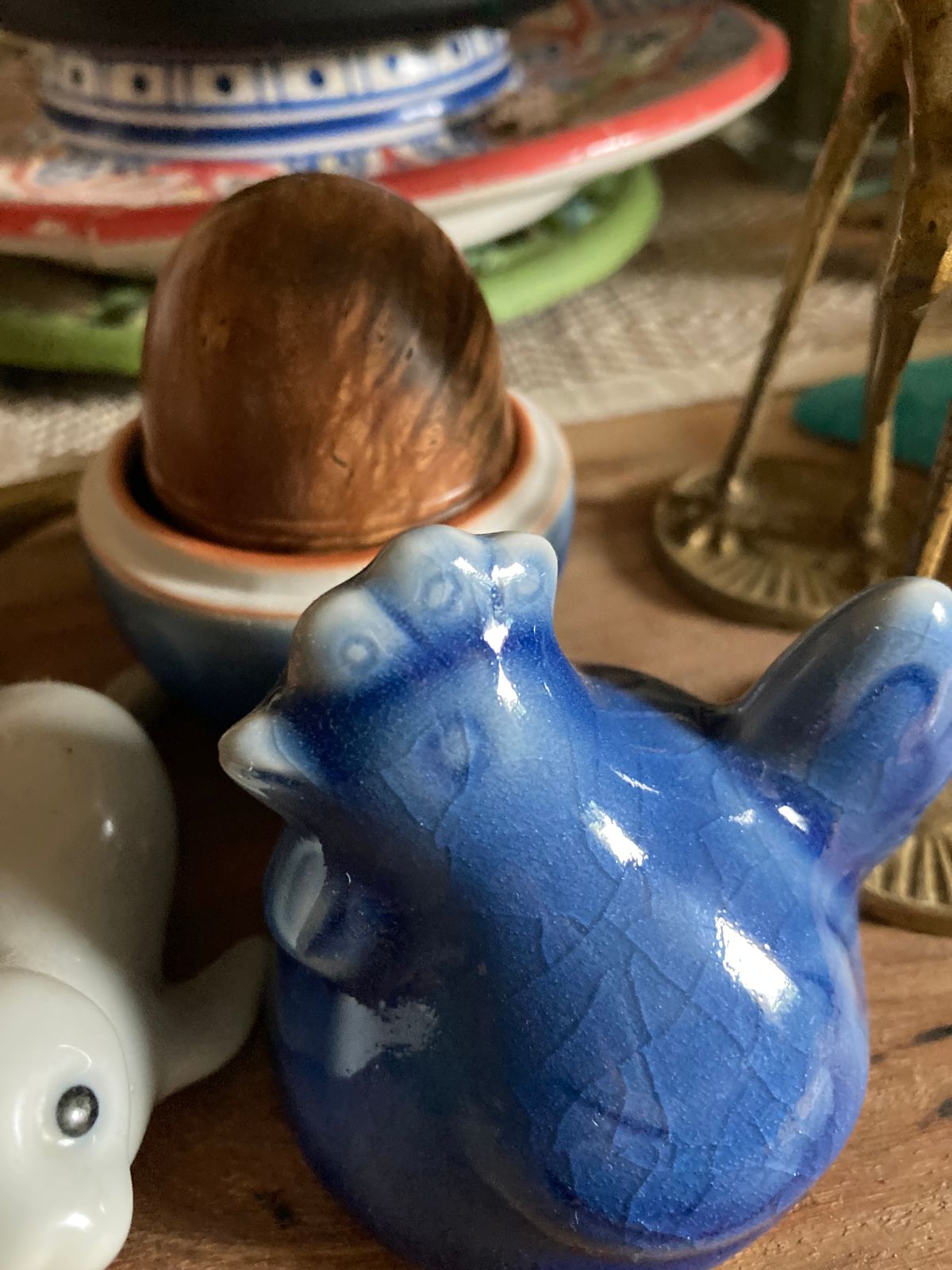 Crafted of ceramic with a crackled blue glaze, two hens make a delightful addition to your kitchen with this pair of egg cups from Thailand. Penpan presents this serveware accessory. Each server features a small bowl for holding a single egg, boiled or coddled. The top portion of each cup is removable.
