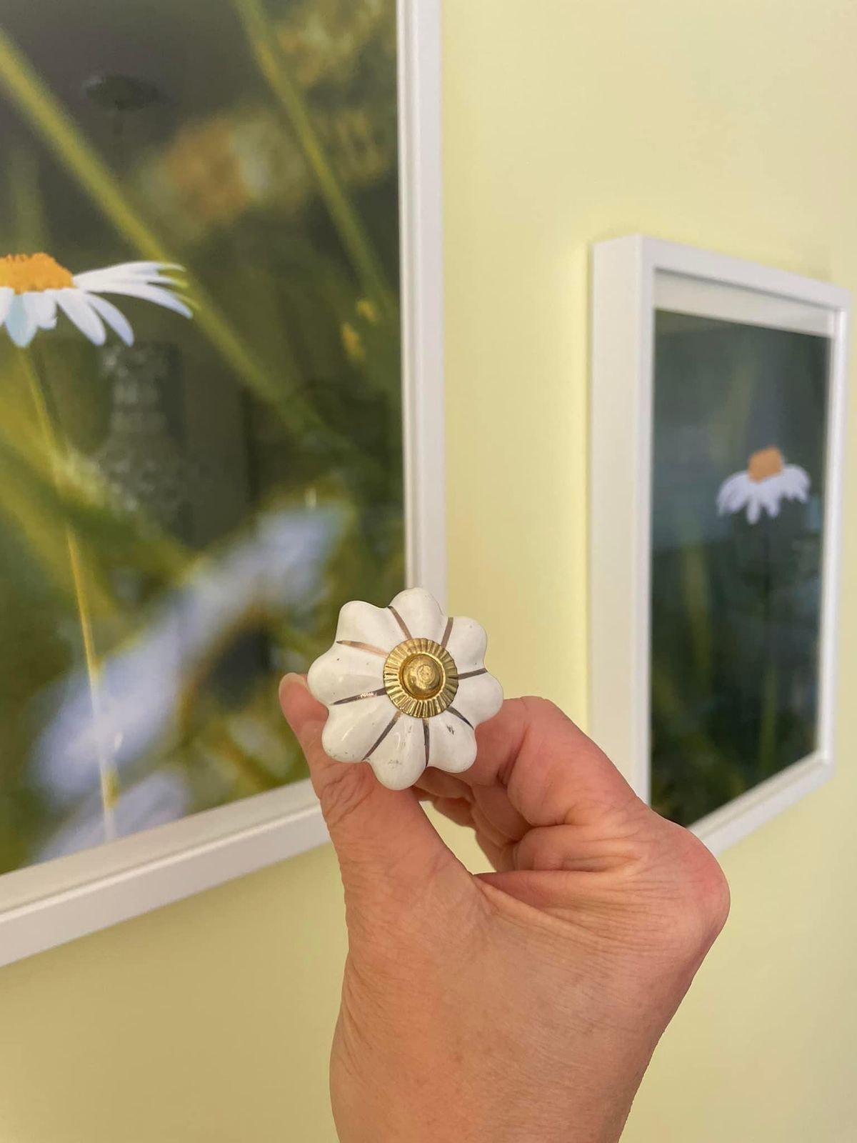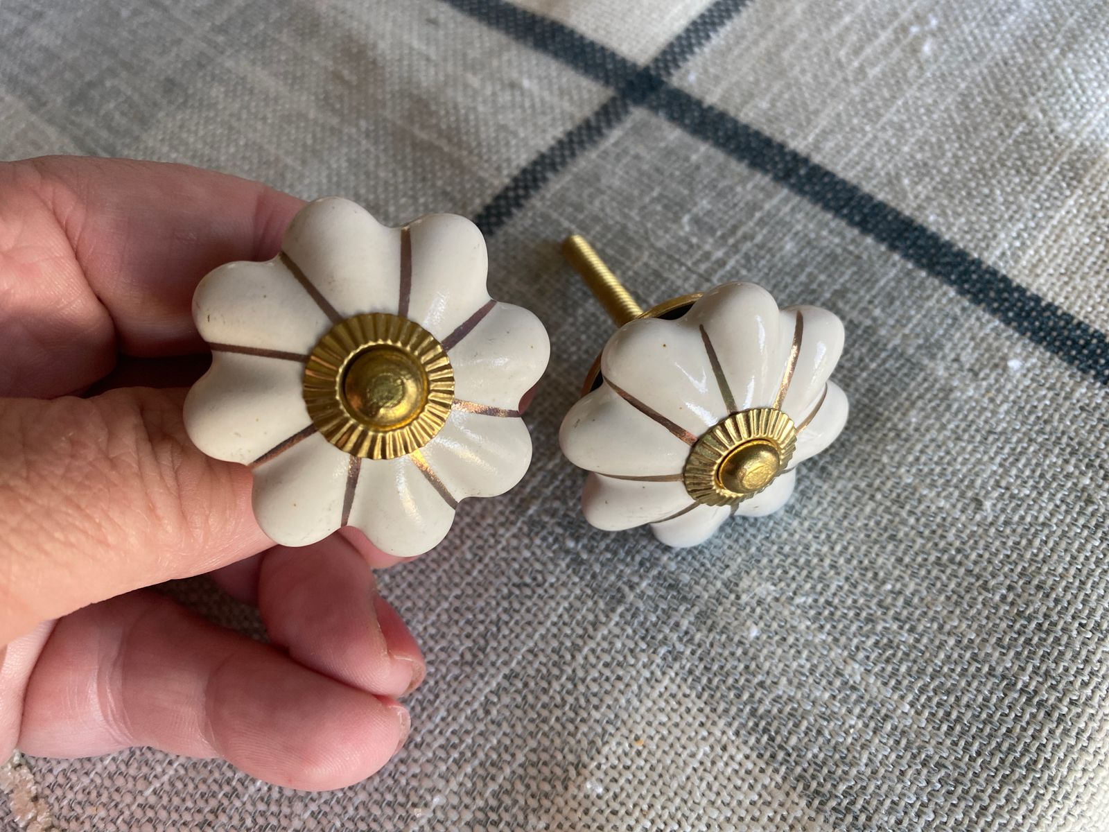 Handcrafted from ceramic, these Indian cabinet knobs are made by Khalid Ali. Their floral shapes are glazed in an off-white color, making a handy and lively addition to any drawer or cabinet.