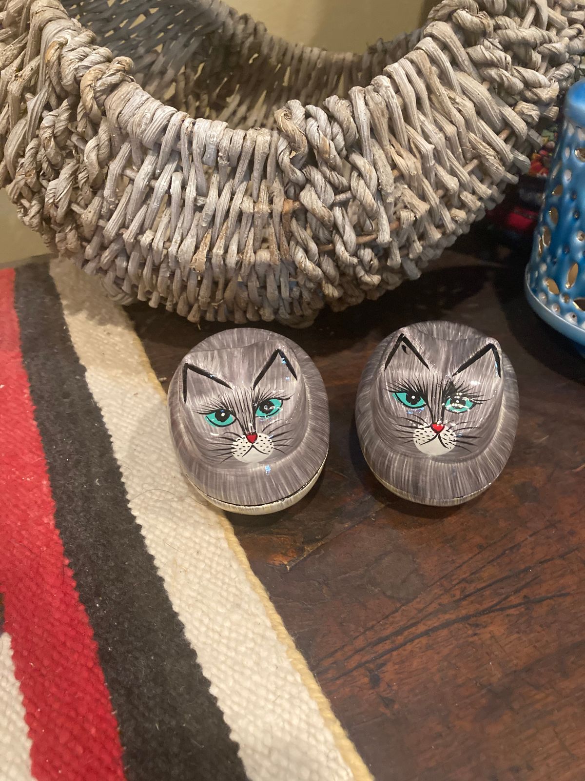 Two purring kittens lounge contentedly in this charming design by Fida Hussain. The Kashmiri artisan works in hand-painted papier mache, depicting sweet faces, inquisitive whiskers and big green eyes. The cats are actually decorative boxes to hold small keepsakes and treasures.