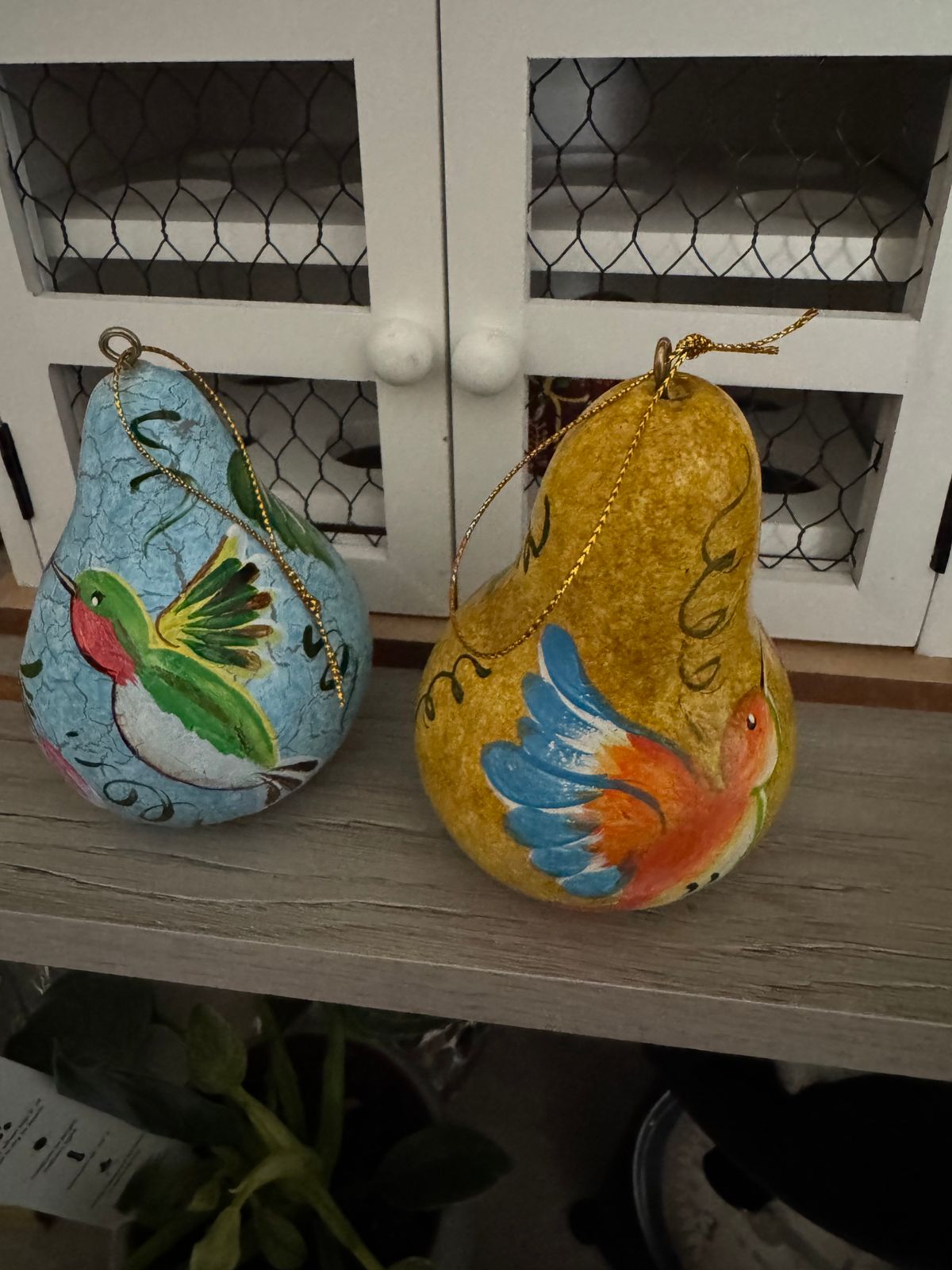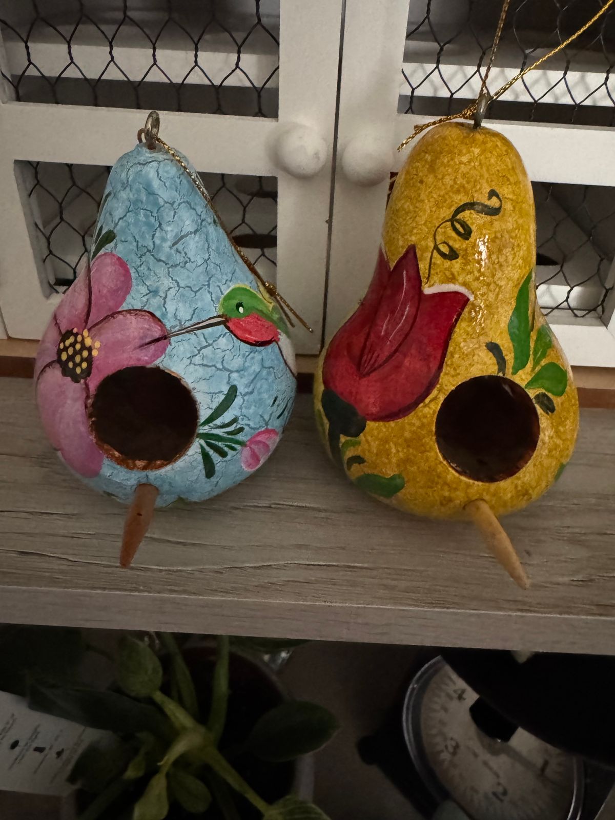 Peruvian artisan Percy Rojas's crafts this set of two dried gourd ornaments designed as tiny bird houses. The artisan grows, harvests and dries the gourds himself using them in wonderful and creative ways. Each ornament is hand painted with floral details in vivid colors to brighten any tree or Christmas decor. They can also be used outdoors and make a great gift for bird watchers.