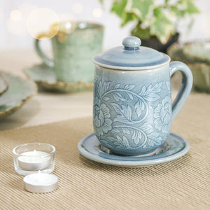 Classic Crackled Blue Celadon Ceramic Covered Cup and Saucer - Luxury Peony in Blue