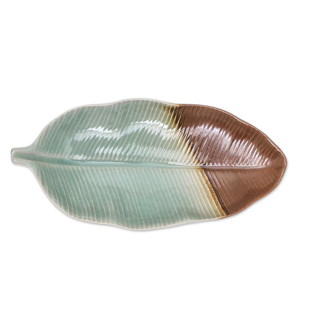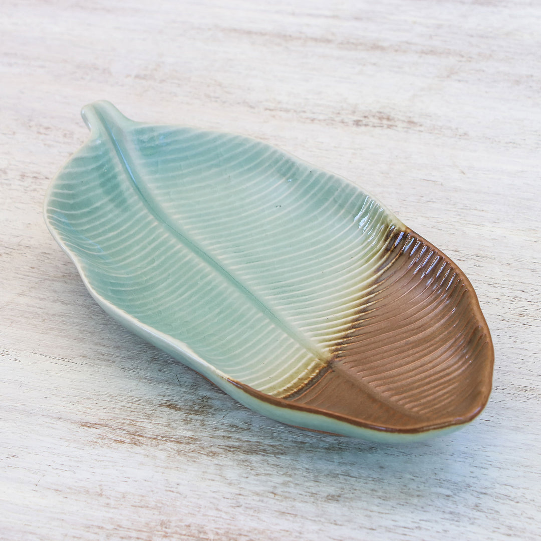 Leaf-Shaped Celadon Ceramic Platter from Thailand - Nature Present