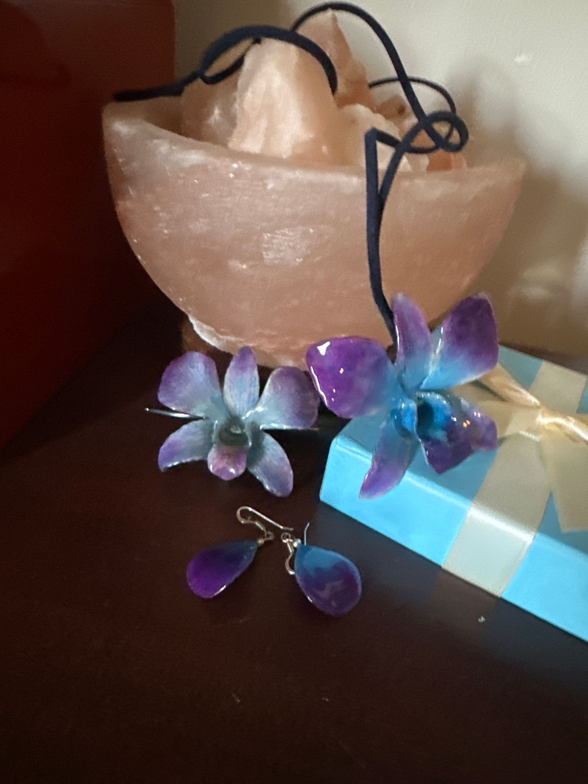 Delicately tinted in blue and purple tones, orchid petals dance on sterling loops. Danai encases natural dendrobium orchid hybrid petals in resin to preserve their ephemeral beauty. The earrings hang from silver wires.