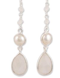 Achieving harmony, rainbow moonstone beads and teardrops combine with two glowing cultured pearls. India's Neetu Barathi designs this pair of dangle earrings, which is crafted from high-polish sterling silver.