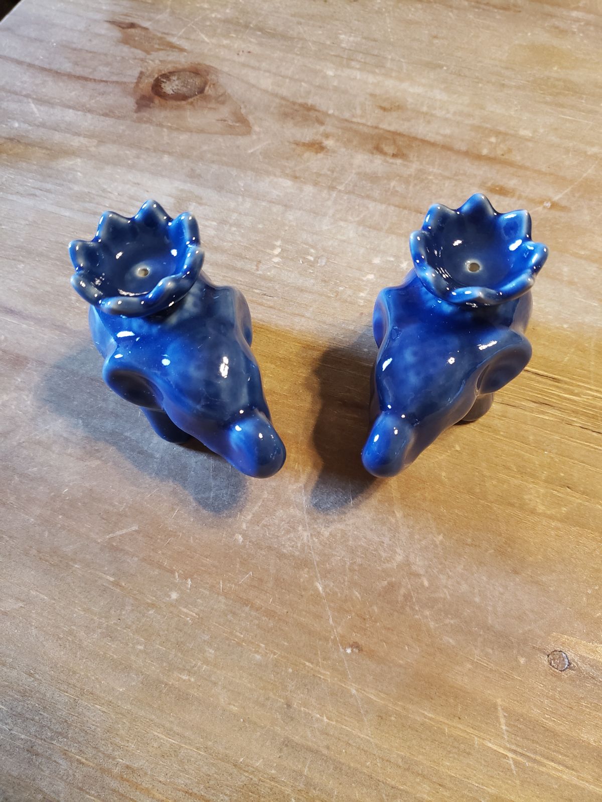 Charoensri of Thailand creates this pair of ceramic incense holders in the form of an elephant carrying a lotus flower, both important symbols in Thai culture. The lotus flower is often a symbol of enlightenment, and the elephant has been celebrated for its longevity, endurance, and strength. The incense holders are glazed in blue with a crackle finish and have a small hole at the top for placing an incense stick.