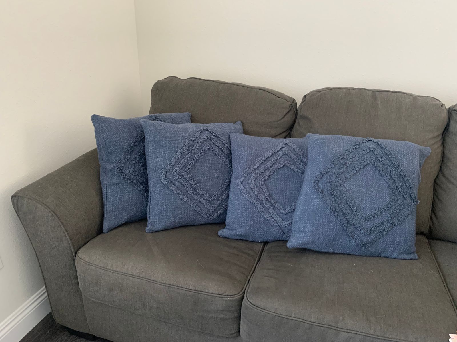 Embroidered with a fluffy diamond motif, Sandeep Malhotra's four-set of cushion covers add soft texture and beautiful color to your living space. Indian artisans craft the set from slub cotton, using tufted embroidery work to create the diamond pattern. Each cadet blue cushion features a zippered closure for inserting and withdrawing your favorite cushions.