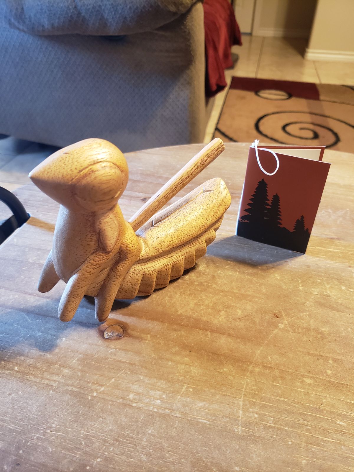 This adorable little cricket is hand-carved from native suar wood by Trisna Dewi. Inspired by traditional Balinese dancing as a young girl, Trisna loves creating musical instruments influenced by the music she grew up enjoying. A rod is included as part of the design, and can be used to create a fun 'cricket-like' sound when rubbed against the wings of the cricket as a percussion instrument.