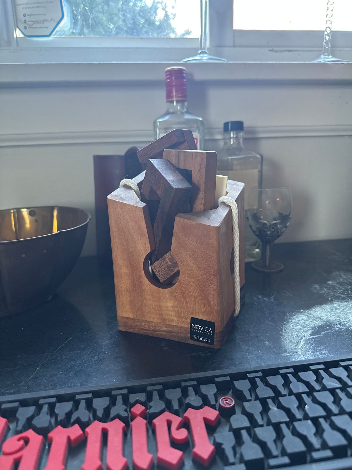 Demonstrating his creativity and love for games, Thai artisan Waraporn Khamsuk creates this ingenious puzzle that is perfect for entertaining friends and guests. The goal is to figure out how to free a wine bottle using four pieces of interlocking rain tree wood, a task which will prove to be an enjoyable and motivating challenge. The puzzle is reusable and fits a 12 inch by 3 inch wine bottle.