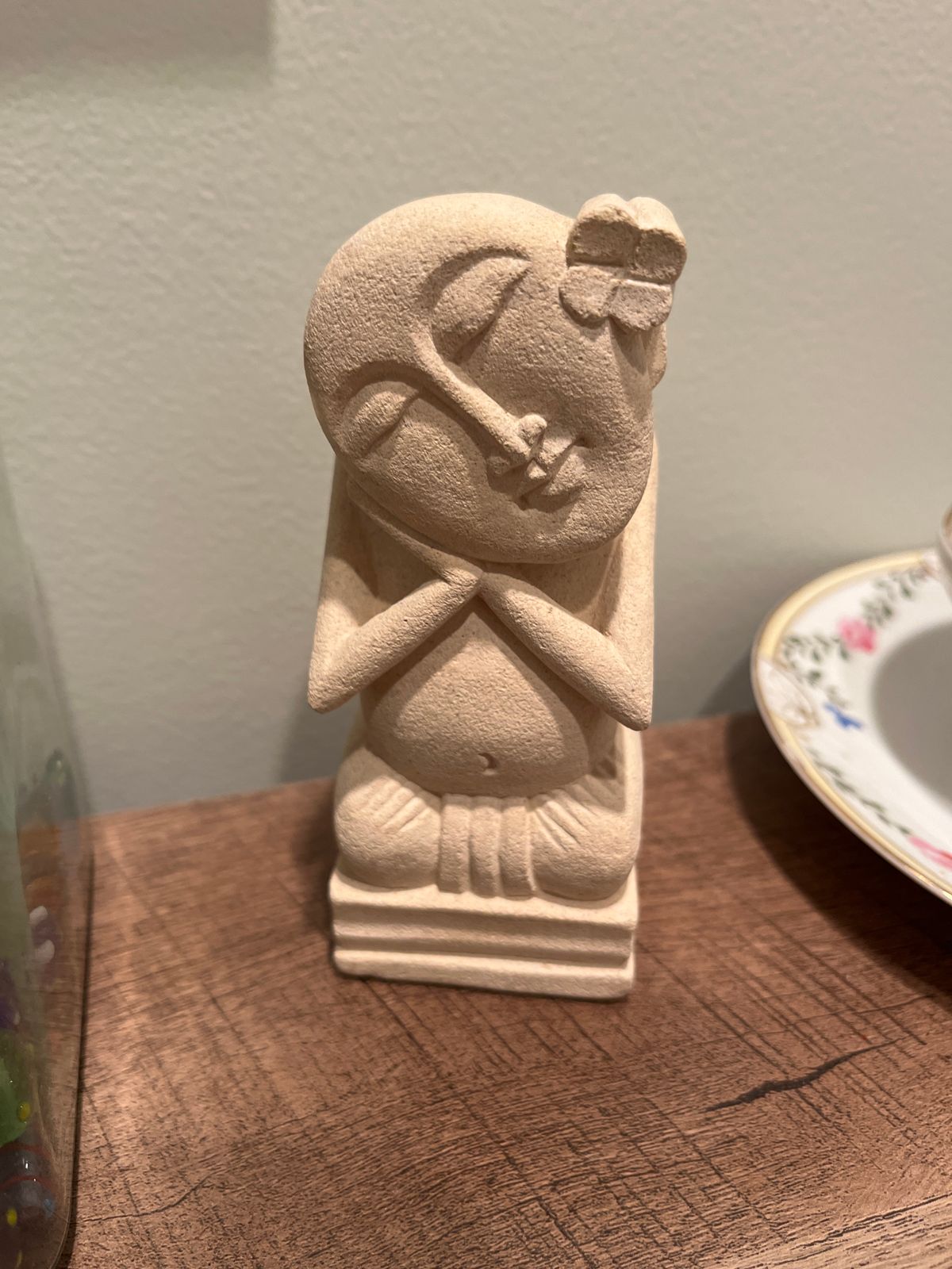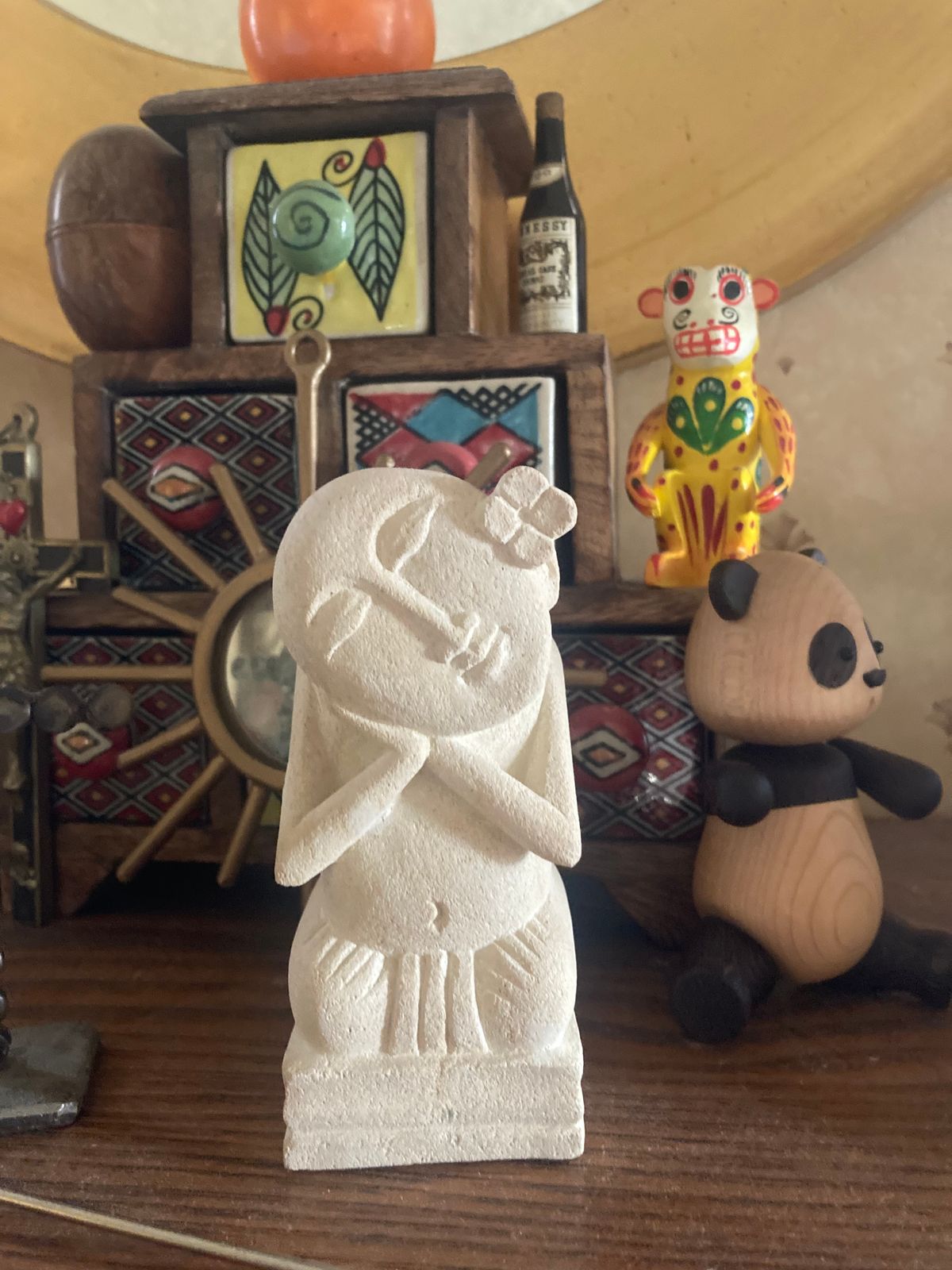 A child rests her head upon her hands in a dreamy daze. A slight smile is seen across her lips with a flower tucked behind her ear. Indonesian artisan Wayan Kandiyasa depicts his subject in a sandstone sculpture.