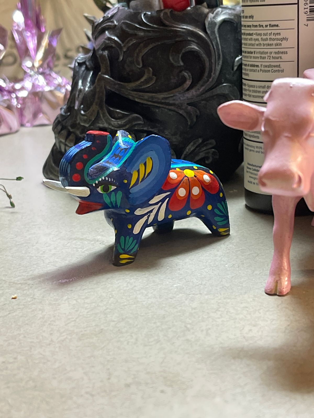 This charming small figurine is from Manuel Delfino in Guatemala, who is inspired by the Mexican art form of alebrijes. The elephant is carved by hand from pinewood and carefully hand painted in colorful detail.