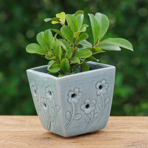 Celadon Ceramic Mini Planter with Floral Motif in Blue - Blue Little Garden