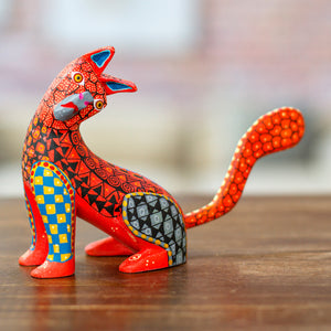 Wood Cat Alebrije Figurine in Red Hand-Painted in Mexico - Curious Cat in Red