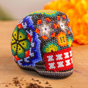 Mexican Hand Painted Terracotta Hue Wooden Skull Figurine - Death and Folklore