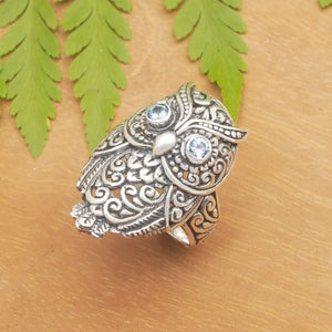Owl-Themed Cocktail Ring with Faceted Blue Topaz Jewels - Loyalty Feathers