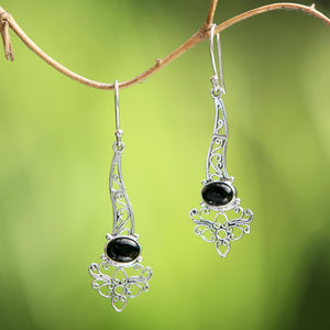 Onyx Sterling Silver Floral Motif Scrollwork Dangle Earrings - Midnight Garden Breeze