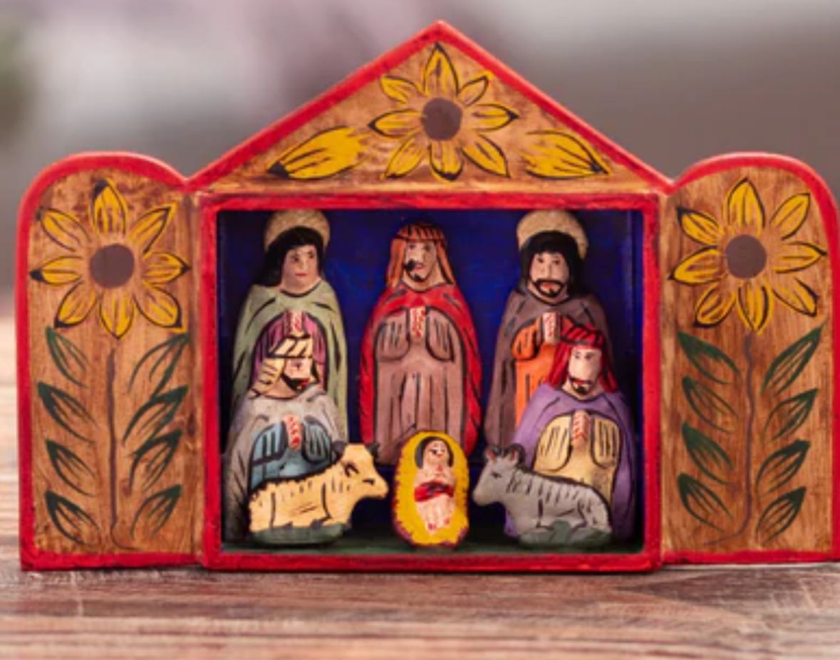 The birth of baby Jesus united each corner of the world in a serene moment where only love reigned. Captured for eternity, that scene remains alive in this wood nativity retablo by Peruvian artisan Alejandro Chavez. Hand-painted floral details and ceramic figures compose this tender creation, infused with an aura of peace.