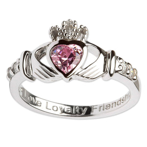Pink CZ Birthstone Claddagh Ring - July