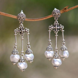 Silver and White Cultured Pearl Chandelier Earrings - Trinity in White