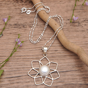 925 Silver Floral Pendant Necklace with Peach Cultured Pearl - Floral Glare