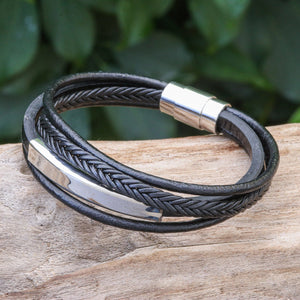 Leather Strand Bracelet in Black from Thailand - Mighty Strength in Black