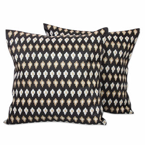 Embroidered Beige Stars on Black Satin Cushion Covers (Pair) - Midnight Desert