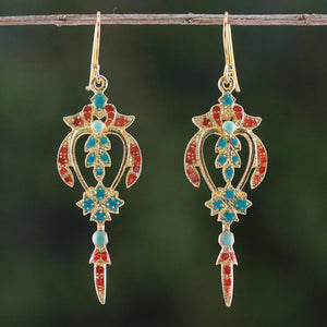 Gold Plated Brass Earrings in Green and Red from Thailand - Proud Beauty in Red