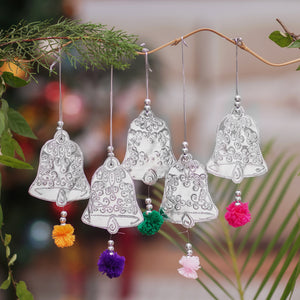 Set of 5 Embossed Aluminum Bell Ornaments from Bali - Celebration Bells