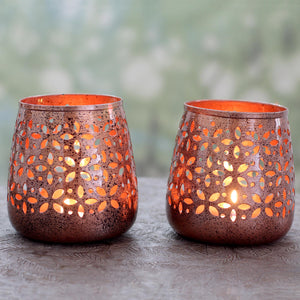 Pair of Copper Plated Steel Floral Tealight Candle Holders - Flower Glow