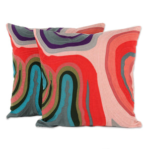 Abstract Embroidered Cotton Cushion Covers from India (Pair) - Abstract Morning