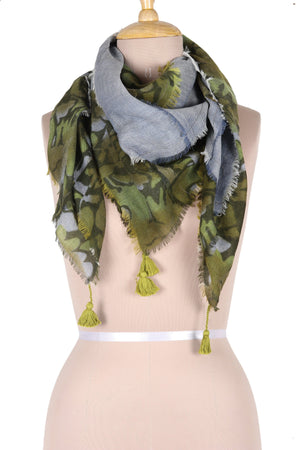 Floral Patched Wool Scarf with Tassels Woven in - Olive Bliss