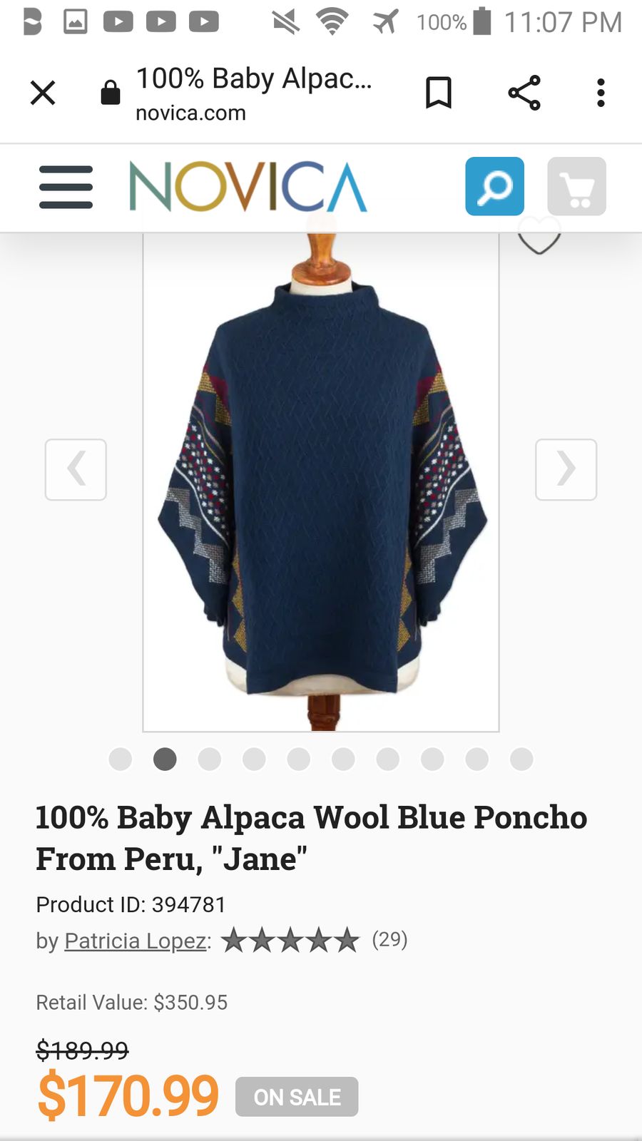 Patricia Lopez's workshop knits this cozy poncho from super soft 100% baby alpaca wool dyed in a deep blue tone. A triangular pattern in contrasting white, crimson, beige, and gold tones adorns the sides and the sleeves. She adds a turtleneck for further coverage and protection from the elements. Patricia Lopez worked for years as an industrial engineer before throwing in the towel to follow her passion for traditional Peruvian weaving and fashion. She runs a workshop in the capital city of Lima where she creates pieces that mix traditional and contemporary techniques and designs.