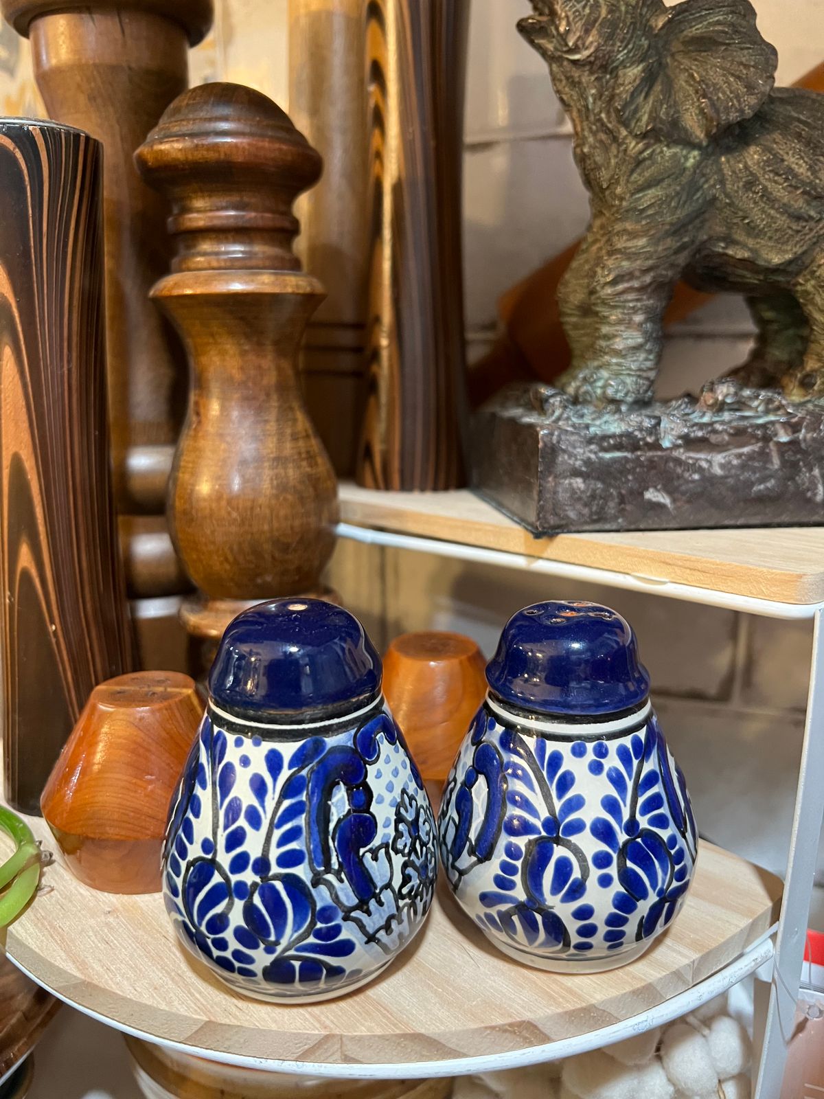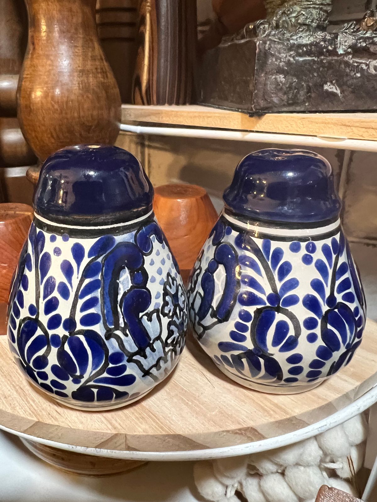 Blossoming on creamy white ceramic, blue flowers flourish amid lacy ferns. Pedro Tecayehuatl works in the classic style of Mexican Talavera to craft beautiful salt and pepper shakers. The elegant pair is decorated in deep, dramatic cobalt, and the glazes are painted by hand. True Talavera comes only from the area of Puebla de los Angeles, where it has been created since the 16th century.