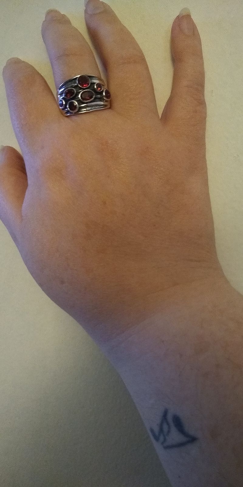 Scarlet with passion, seven faceted garnet gemstones in round and oval shapes decorate the front of this ring from India. Designed by Neetu Barathi, it encircles the finger with a wide band of sterling silver.