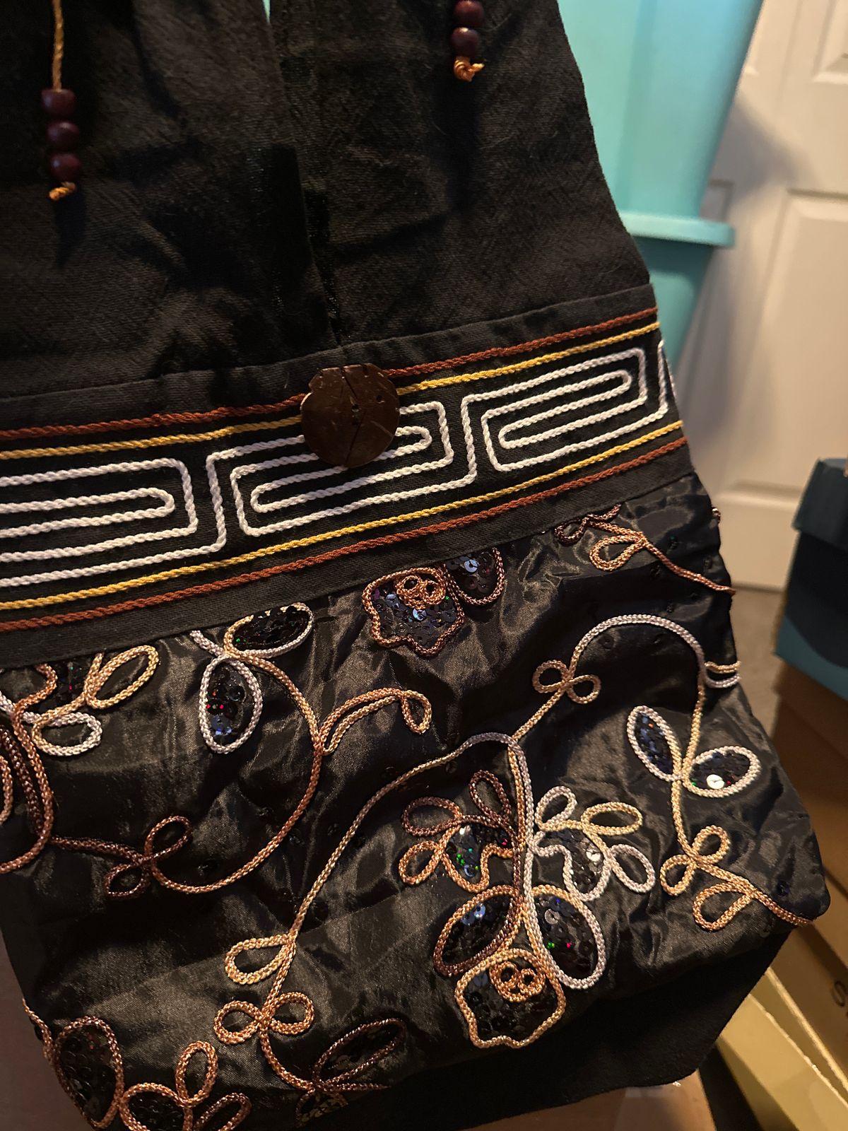 Celebrating the flora of Thailand, Jiap Rojjana designs an elegant cotton shoulder bag. The black bag is accentuated by floral embroidery in hues of brown, complete with swirling designs at the top. Accented with wood beads and gold-colored thread at the strap, the bag opens with a coconut shell button to a cotton-lined interior with an inner zipper pocket.