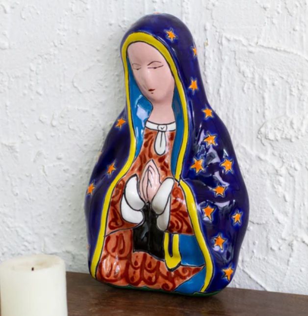 Hands held together in prayer, the Virgin Mary is exalted with this wall sculpture from Mexico. Juana Ponce creates this hacienda-style wall sculpture, which is crafted from ceramic and painted by hand with vibrant colors in the tradition of Talavera handicrafts. This sculpture can be displayed on a tabletop as well as a wall.