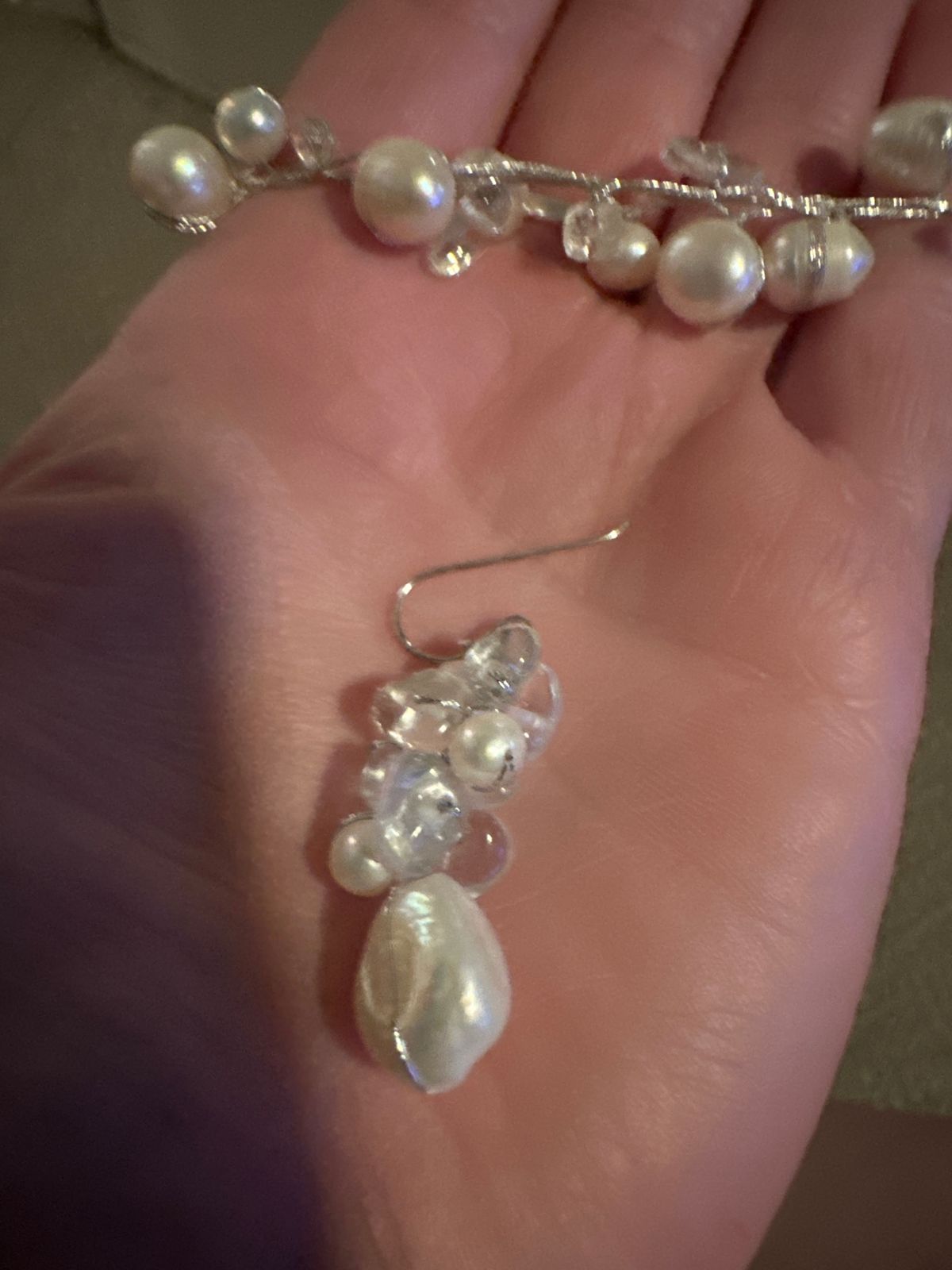 Glistening icicles form a dazzling waterfall in a design by Thai designer Nareerat. She crafts the earrings by hand with white iridescent pearls and clear quartz crystals on silk thread.