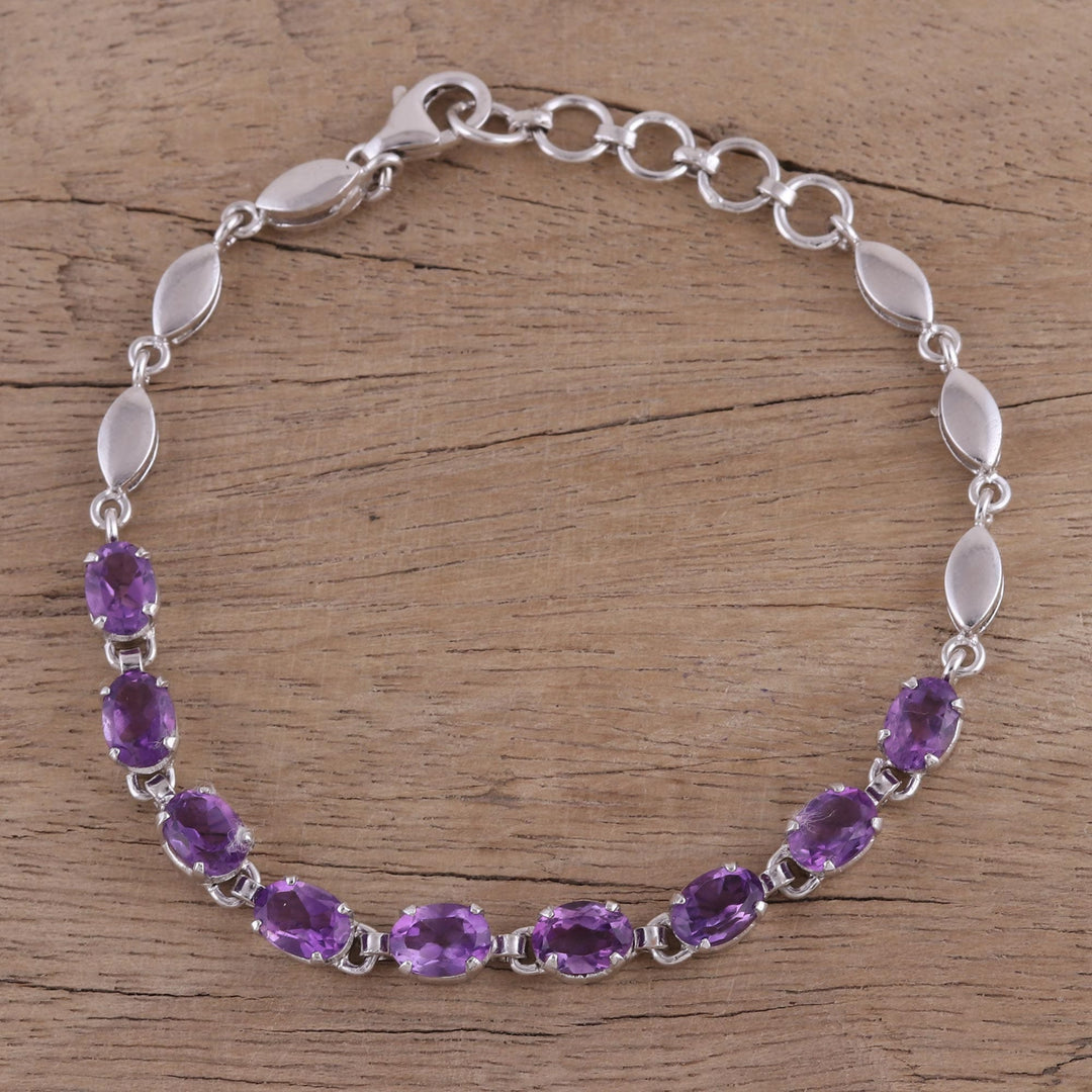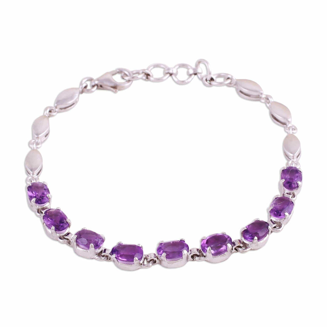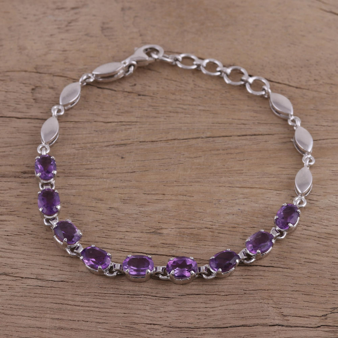 Brilliant rhodium plated sterling silver sets the stage for lavender gemstones in this bracelet from Alok Jain. The tennis-style bracelet features faceted oval amethysts totaling over six carats. The bracelet's length is adjustable.
