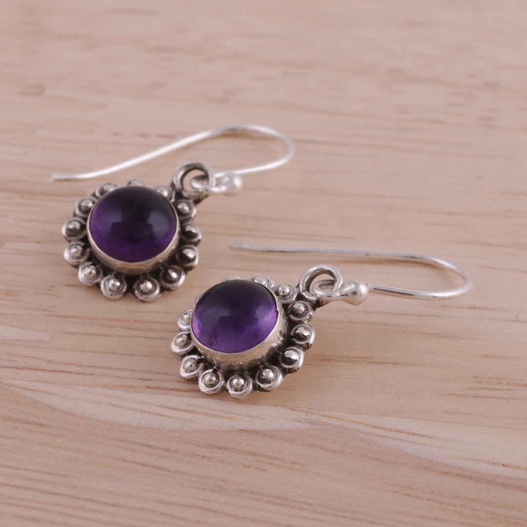 The allure of a flower in bloom is captured in the form of these dangle earrings from Alok Jain. Sterling silver dots make up the petals, blooming around a cabochon amethyst gem in the center. An oxidized finish on the petals give the earrings a vintage charm.
