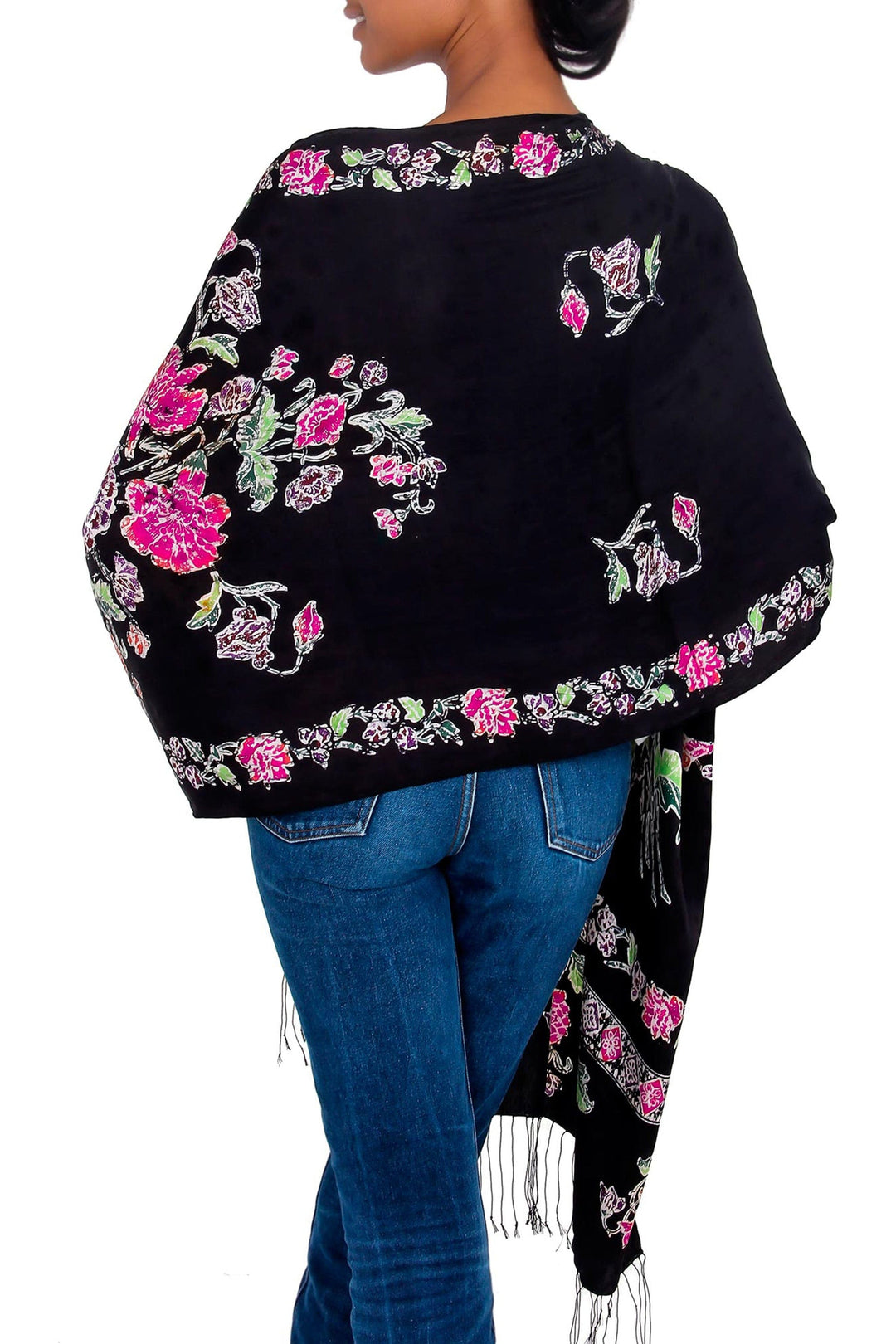 Beautiful blossoms alternate in pink, purple, orange and green. Covering a silk shawl of midnight black, the batik motifs are the creation of Yuni Kristina.