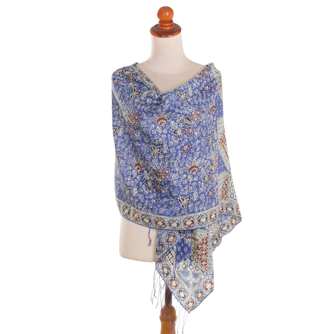 Batik Silk Shawl with Indigo Floral Motifs from Bali - Orchid Temple in Indigo
