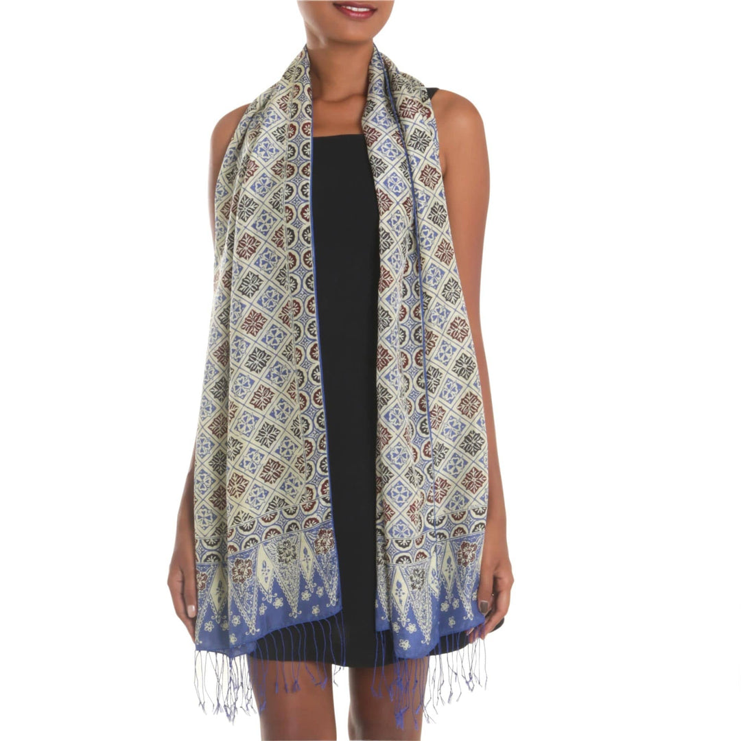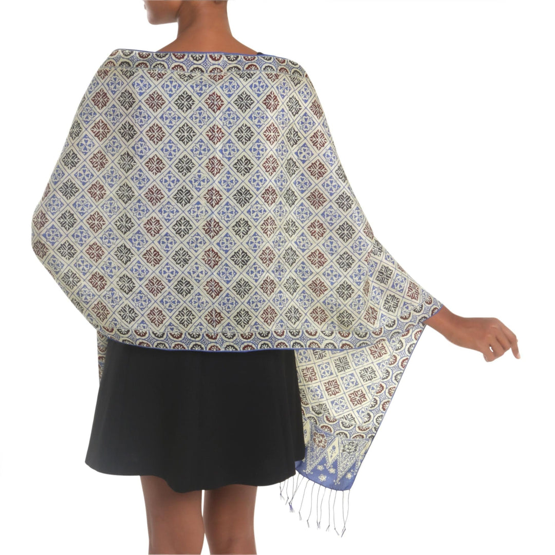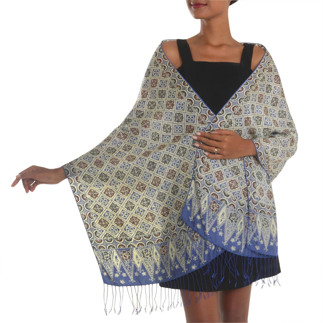 Batik Silk Shawl with Multicolored Floral Motifs from Bali - Ceplok Petals in Indigo