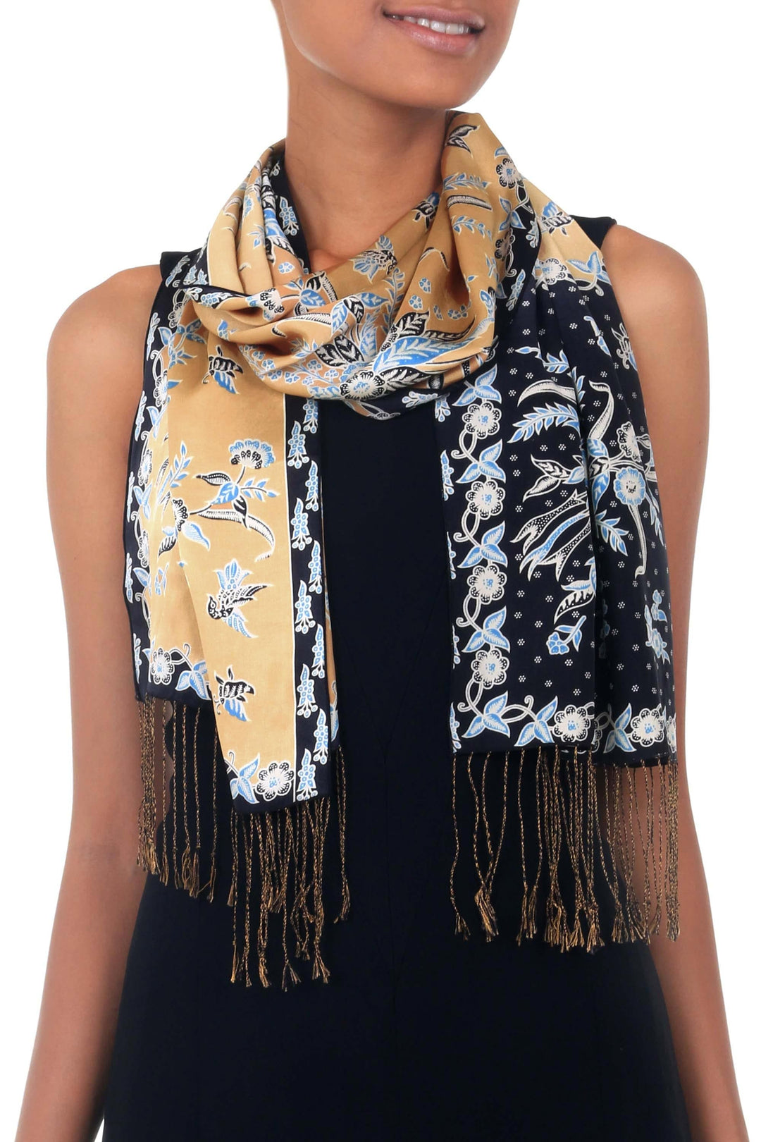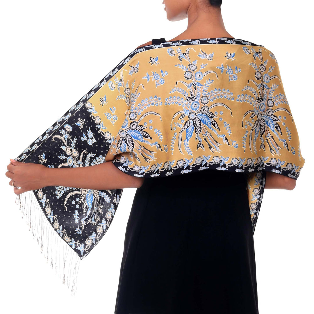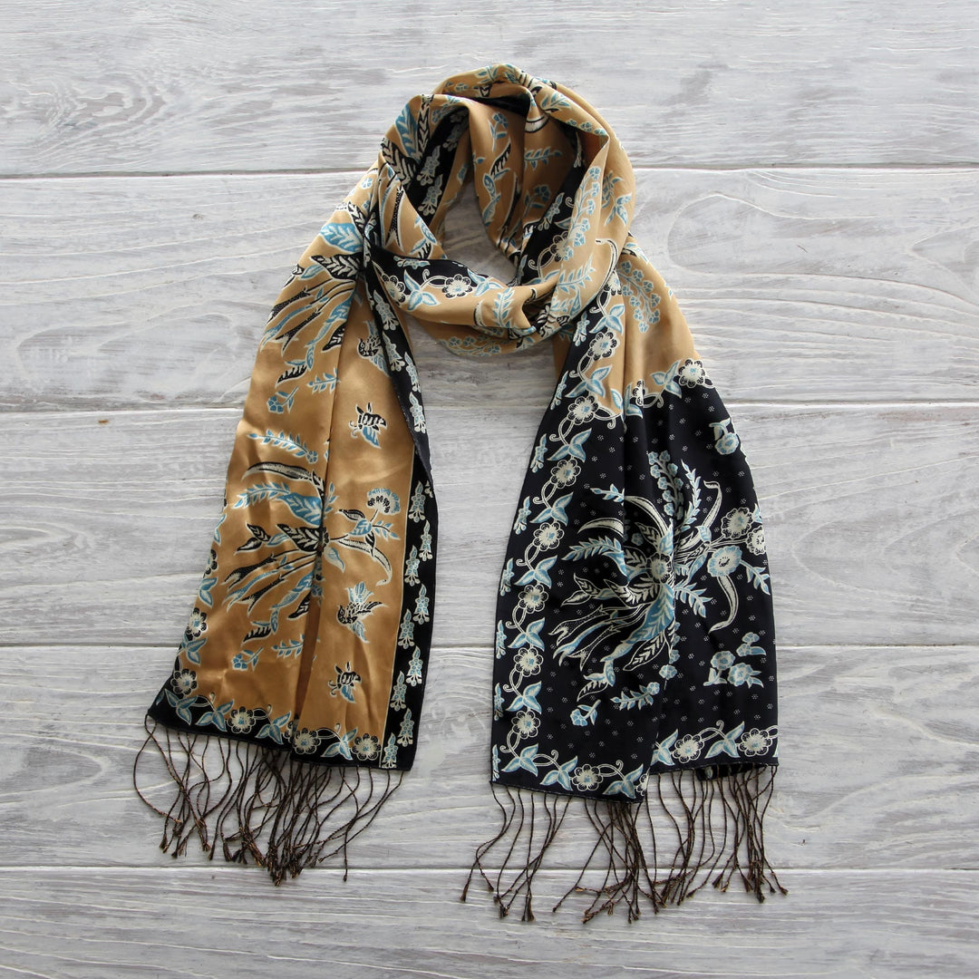 Handmade Silk Batik Scarf with Floral Motifs from Bali - Golden Paradise