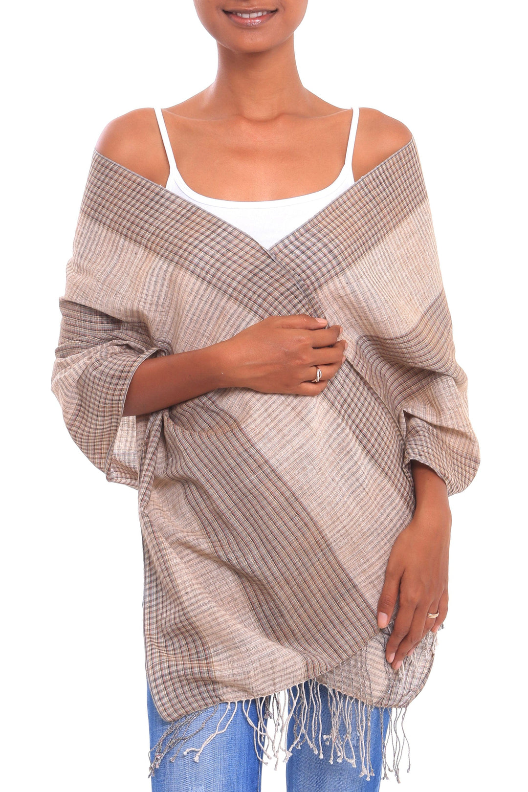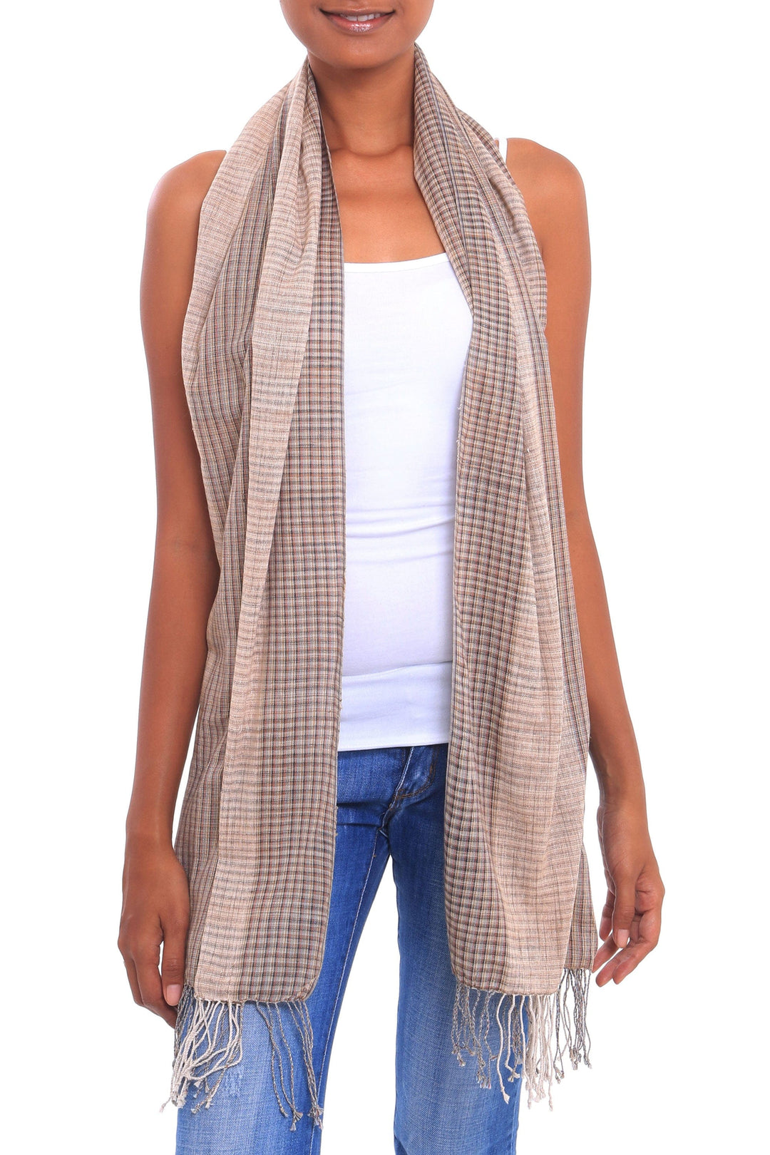 In tones of beige and brown that evoke the beauty of Masceti beach in Bali, this elegant shawl is handwoven of cotton, featuring a plaid pattern. Made Arsana designs the shawl, colored with natural dyes. Majestic fringes complete the shawl at each end.