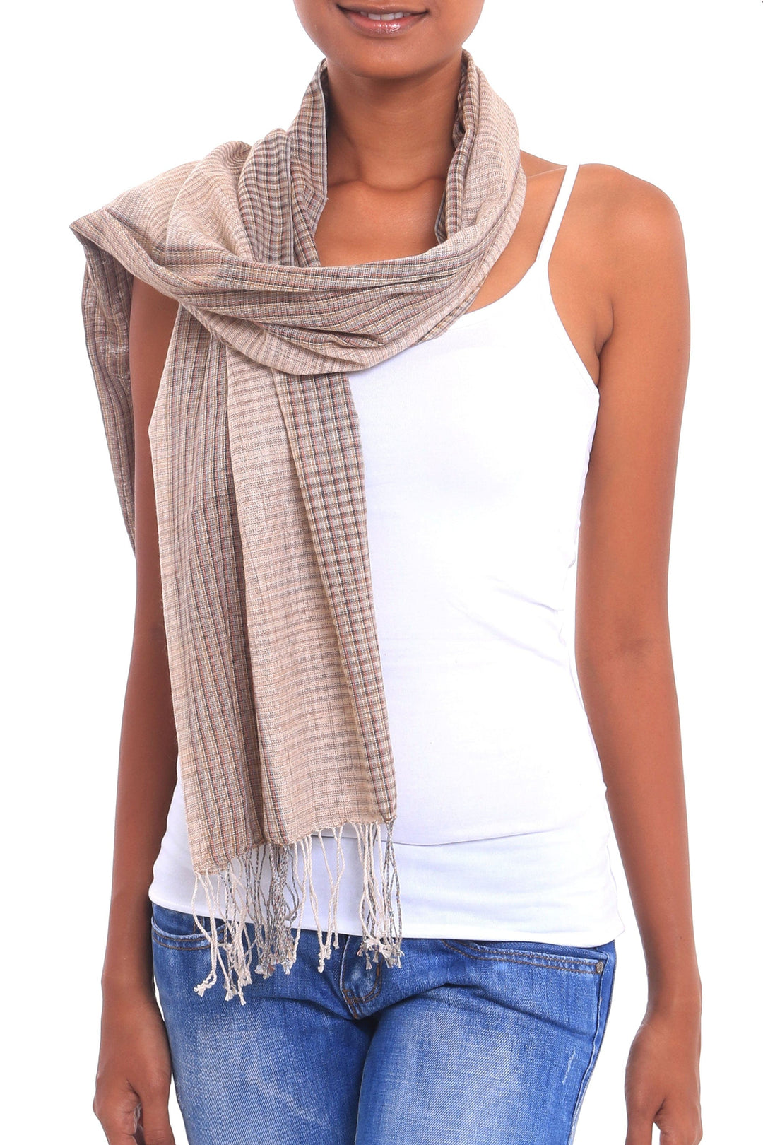 Handwoven Cotton Shawl in Beige and Brown from Bali - Masceti Plaid