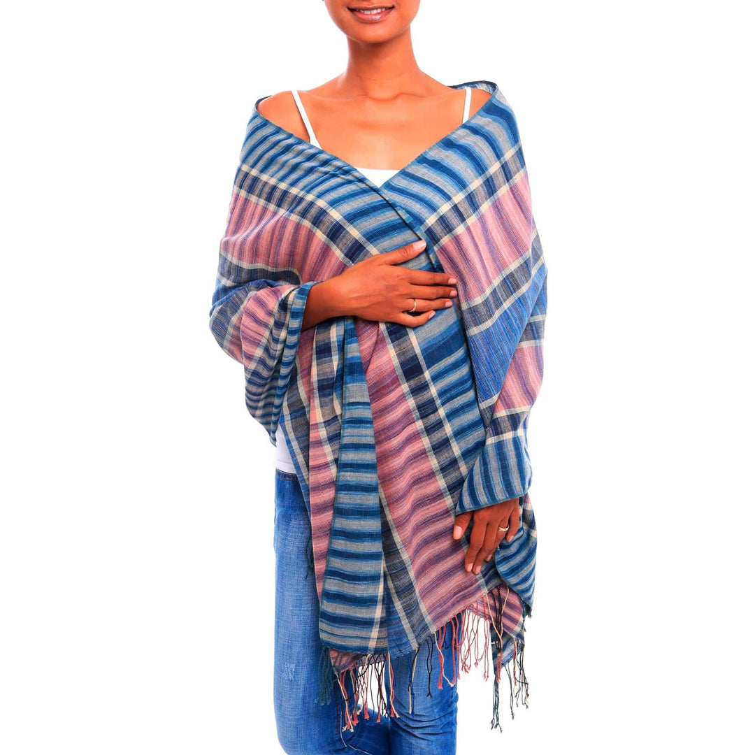 Mauve and Blue Handwoven Lightweight Cotton Plaid Shawl - Surf at Sunset