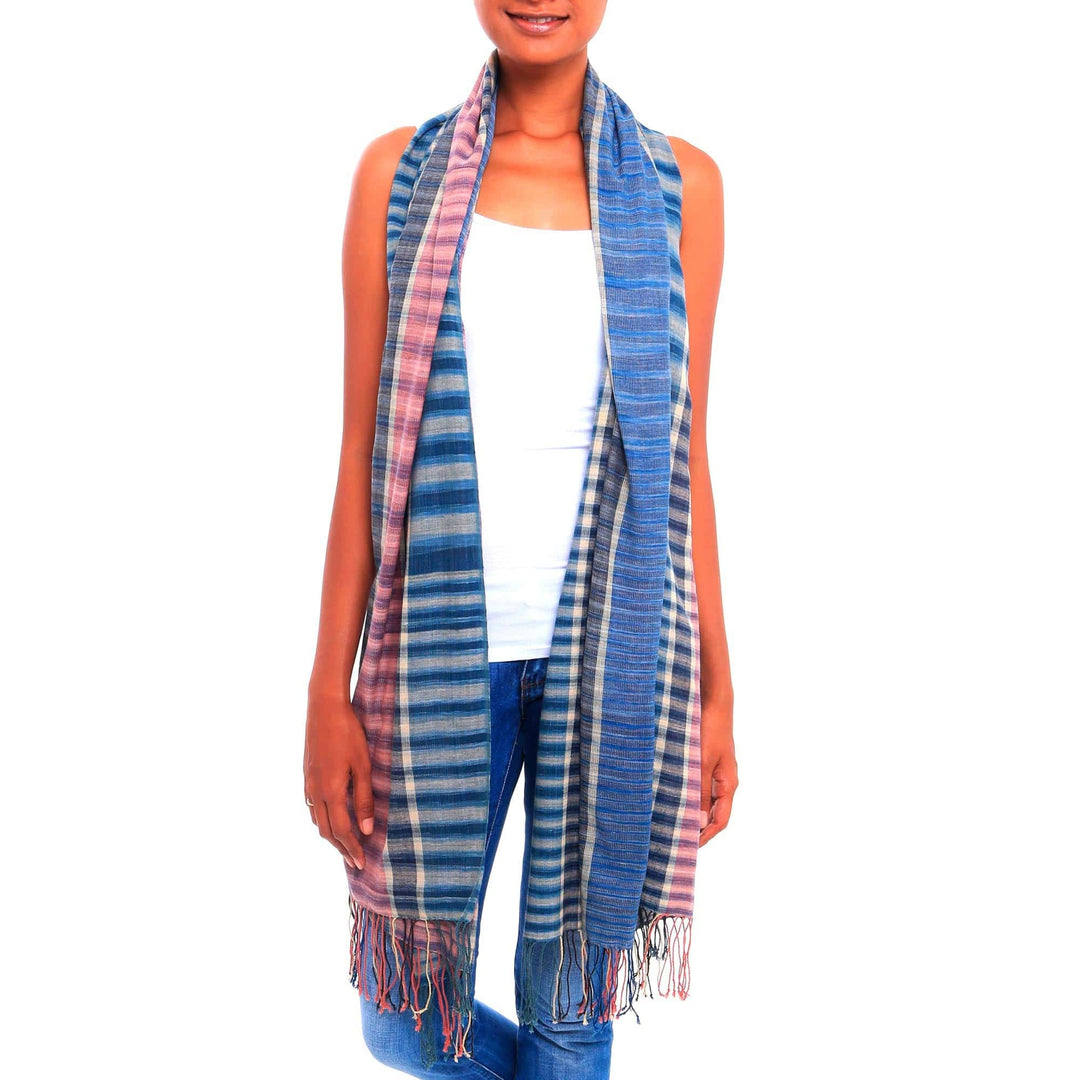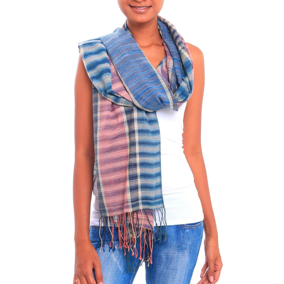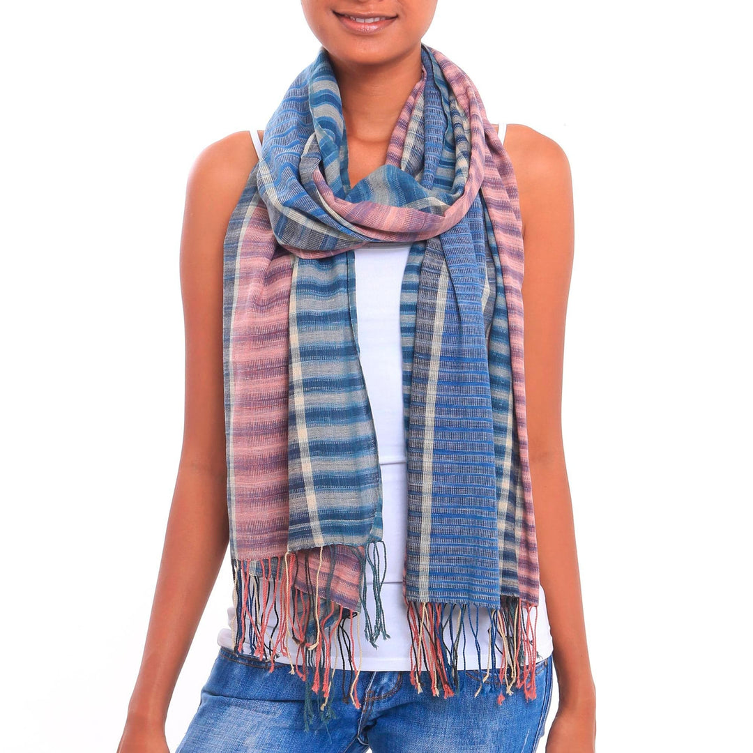 Made Arsana of Bali weaves a colorful and lightweight cotton shawl, perfect for both casual and sophisticated looks. Stripes in both directions accent blocks of color in dusty mauve, denim blue, and vanilla. The wrap is finished with a delicate fringe.