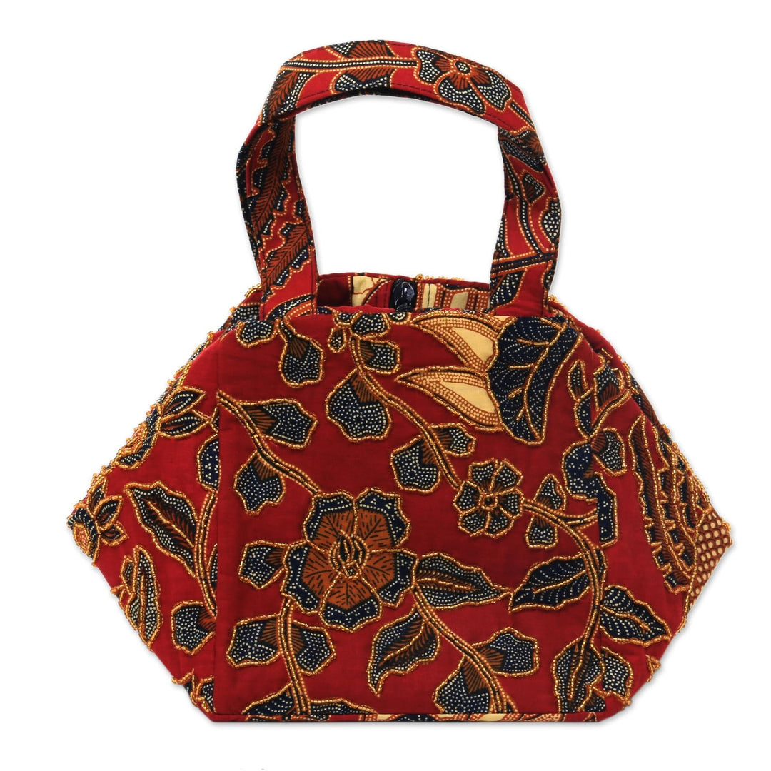 Beaded Red Handbag with Hand Stamped Batik from Bali - Red Peacock